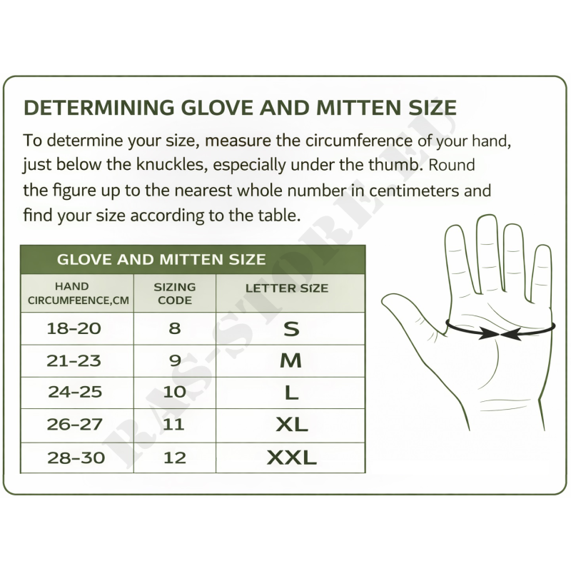 An adjustable strap with buckle at the wrist allows the mittens to be securely fitted to the hand. The foldable pocket covering the glove can be opened by pulling the inner palm strap (Velcro closure) and fixed with a button on the back side for convenience during shooting or precision tasks.
